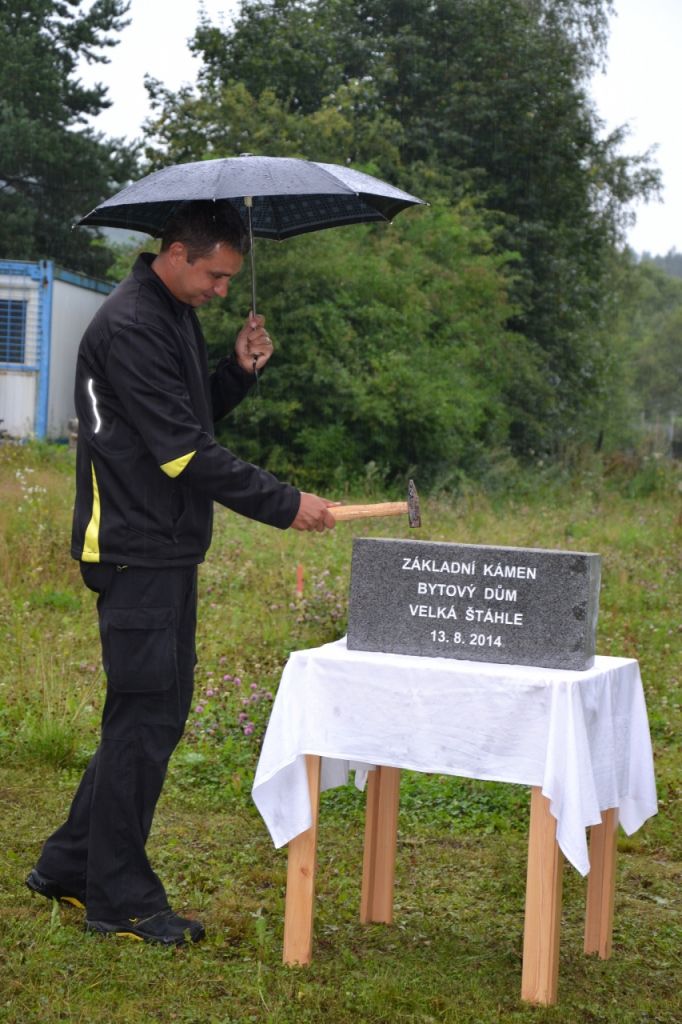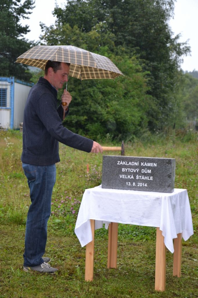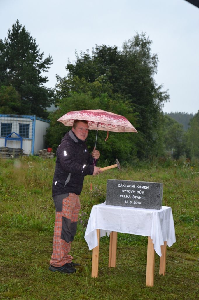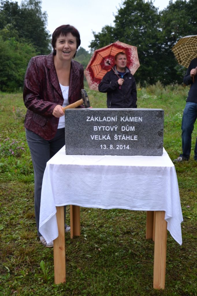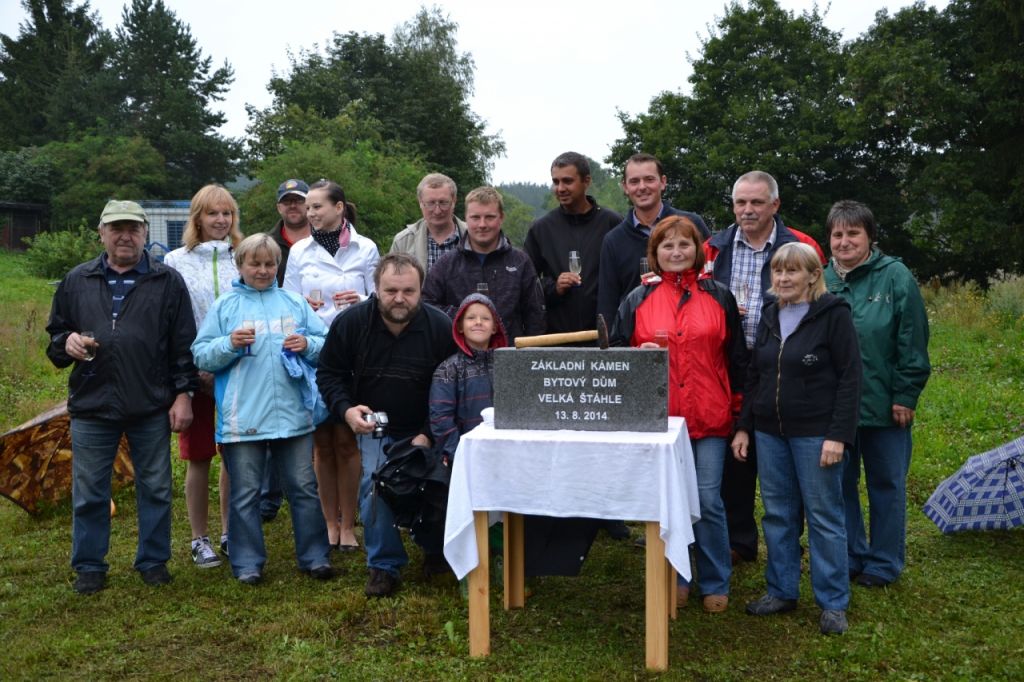 Ve středu 13. srpna 2014 se sešlo zastupitelstvo obce, aby poklepali na základní kámen bytového domu a popřáli mu tak dobrý start. Přestože počasí nepřálo, došli se podívat i někteří obyvatelé obce.
